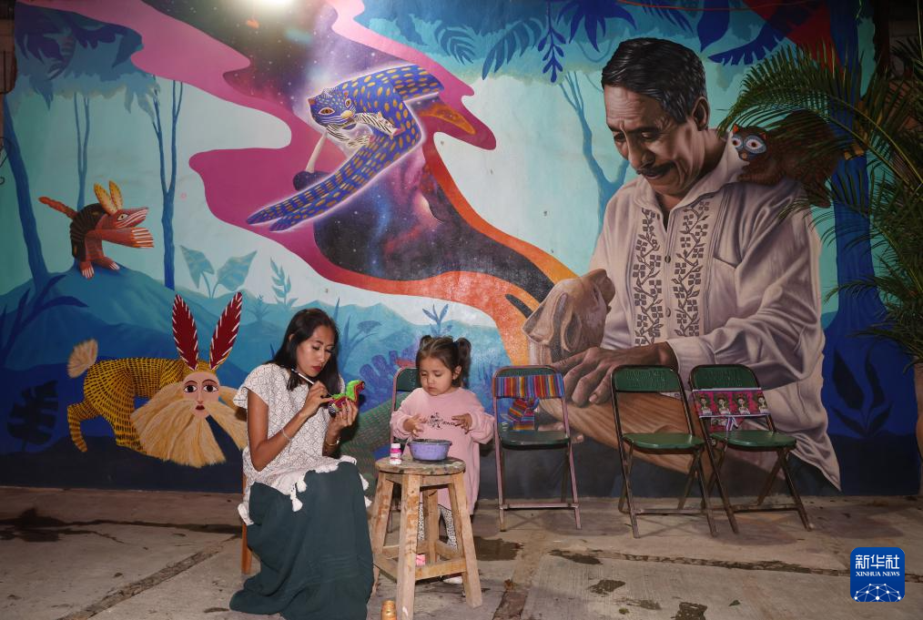 9月16日,在墨西哥瓦哈卡州圣安东尼奥阿拉索拉村一个彩色木雕工坊,一名手工艺人在雕塑上描画花纹。