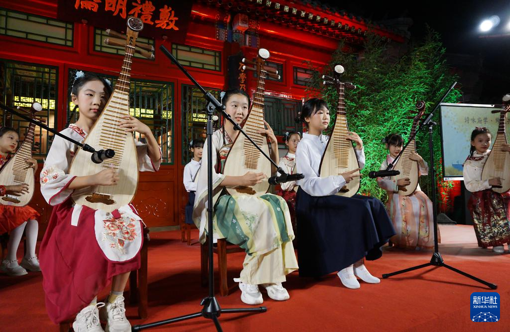 9月28日,北京市东城区府学胡同小学举行主题为“学府诗韵诵中秋,雅乐清音迎华诞”的中秋诗会活动。学生们在活动中以诗词为舟、雅乐为桨,在弘扬传统文化的同时感受秋天的韵律和美感。