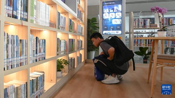在钦州东站,一名乘客在高铁读书驿站寻找心仪的书籍。