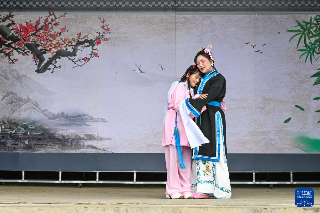 4月1日,在云南省腾冲市甘蔗寨,演员们在表演佤族清戏《安安送米》。