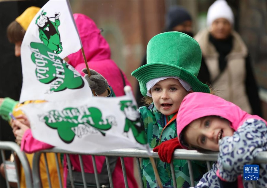 月13日,两名儿童在英国伦敦观看圣帕特里克节游行。