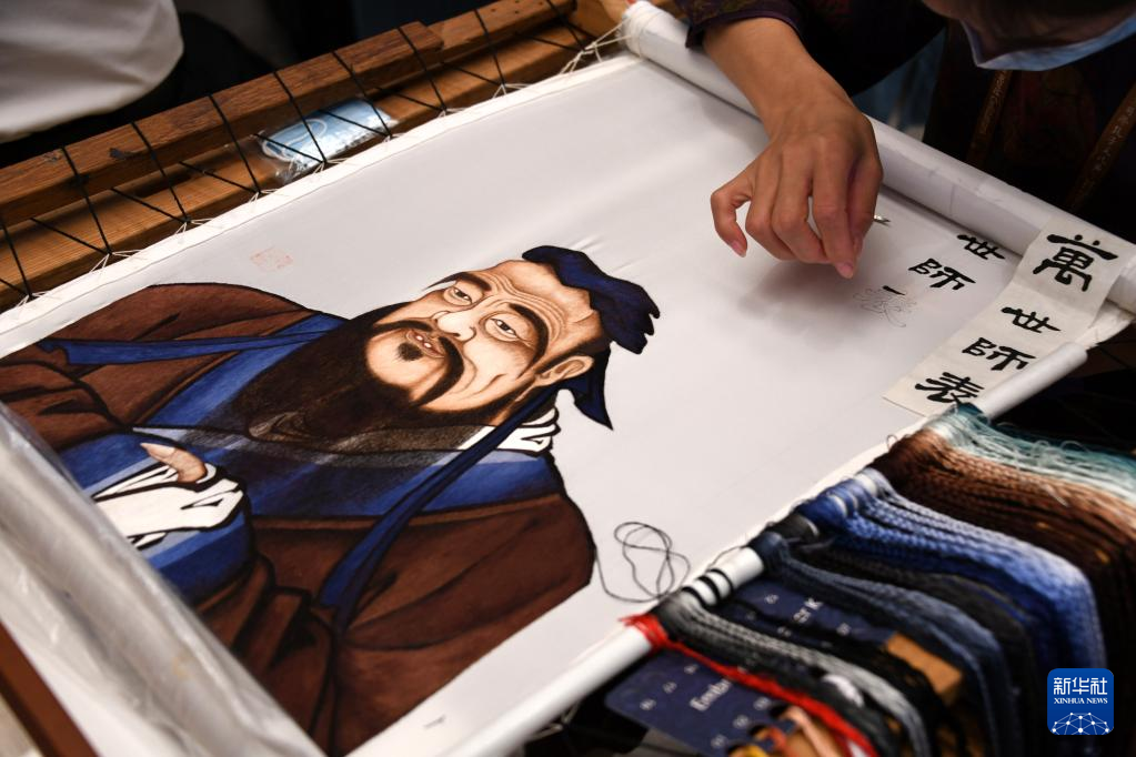 9月26日,锦绣非遗传承人李银凤在创作锦绣孔子像。新华社记者 李紫恒 摄