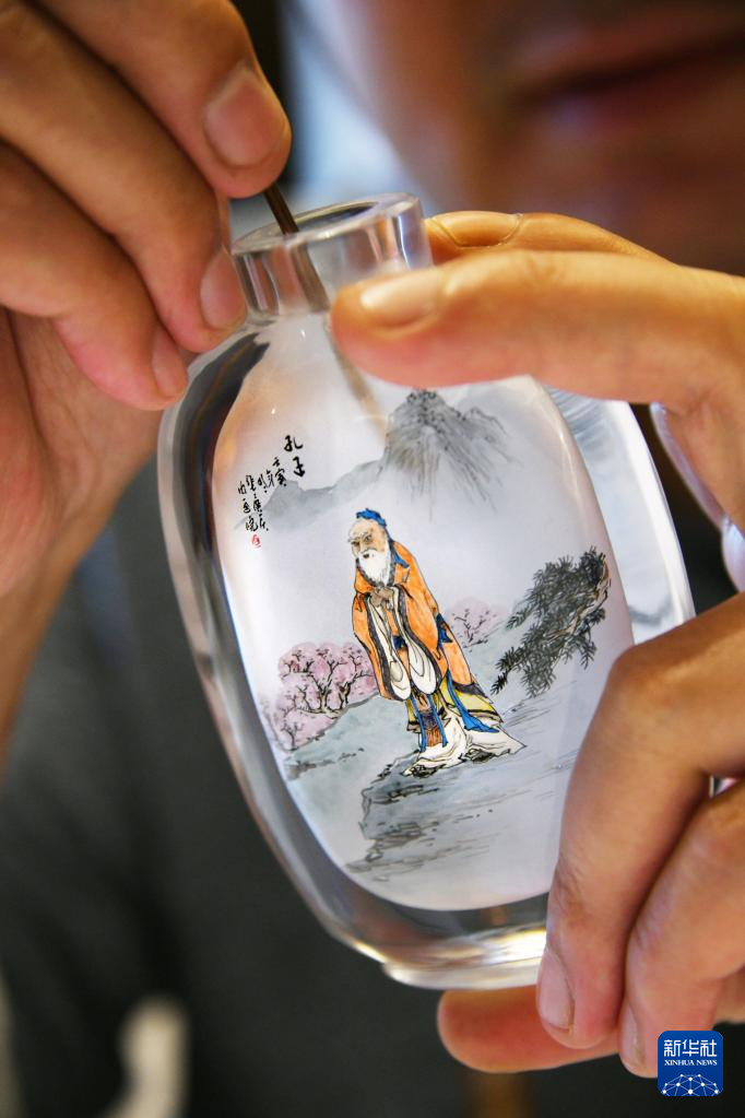 9月26日,鲁派内画非遗传承人张路华在鼻烟壶内画孔子像。新华社记者 李紫恒 摄