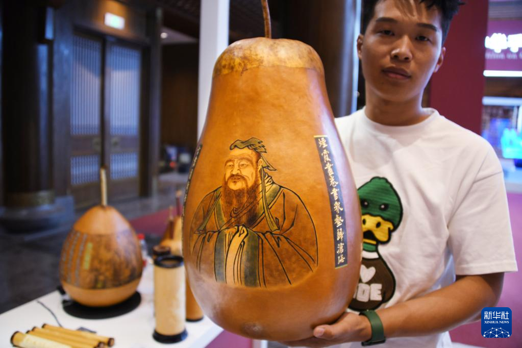 9月26日,葫芦烙画非遗传承人贾飞展示他创作的葫芦烙画孔子像。新华社记者 李紫恒 摄